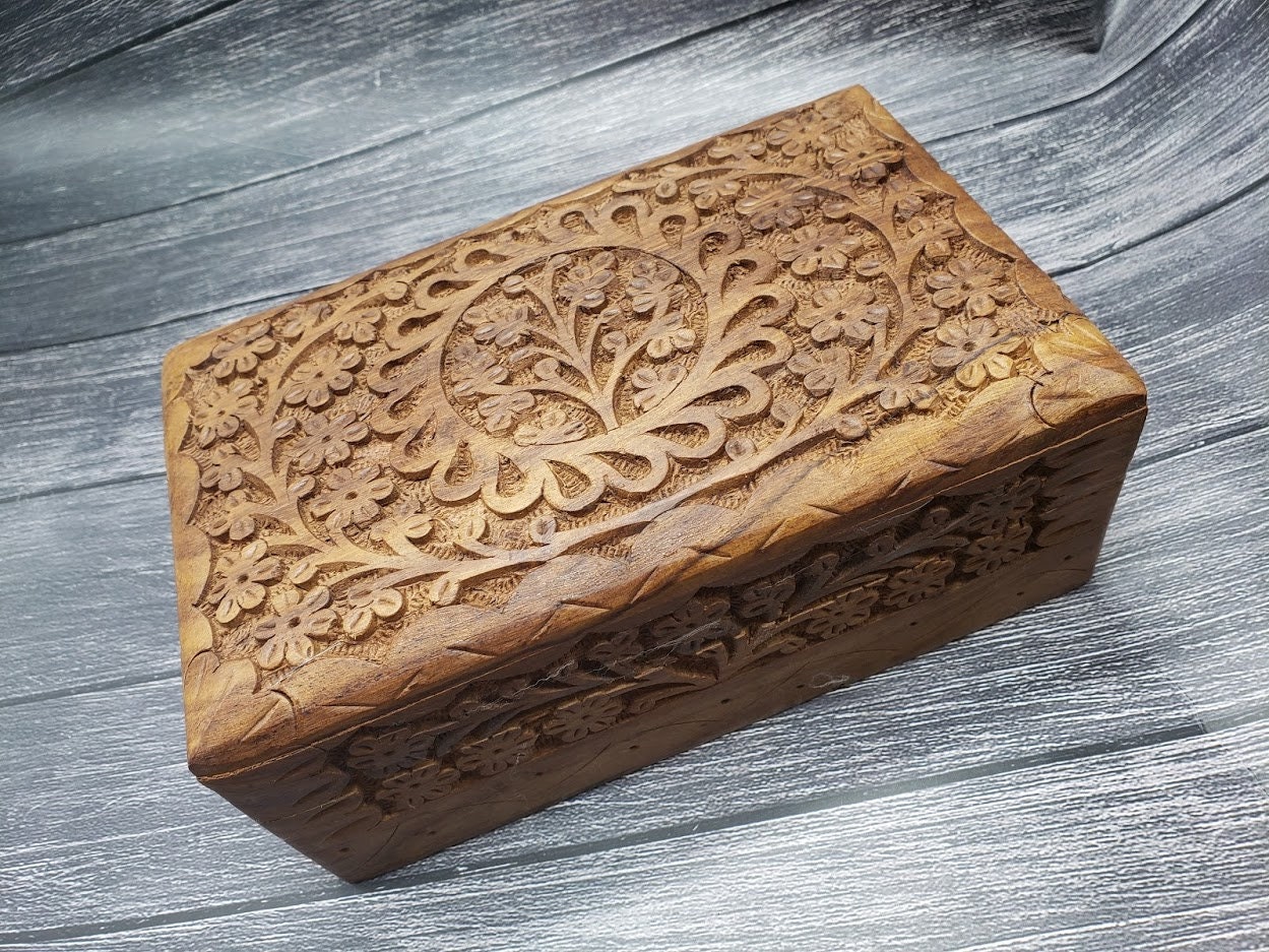 Tree of Life Wood Celtic Carved Chest, Irish Wooden Box, Renaissance Welsh Keepsake, Engraved Magic Box, Witch Tarot Card, Wiccan, Pagan