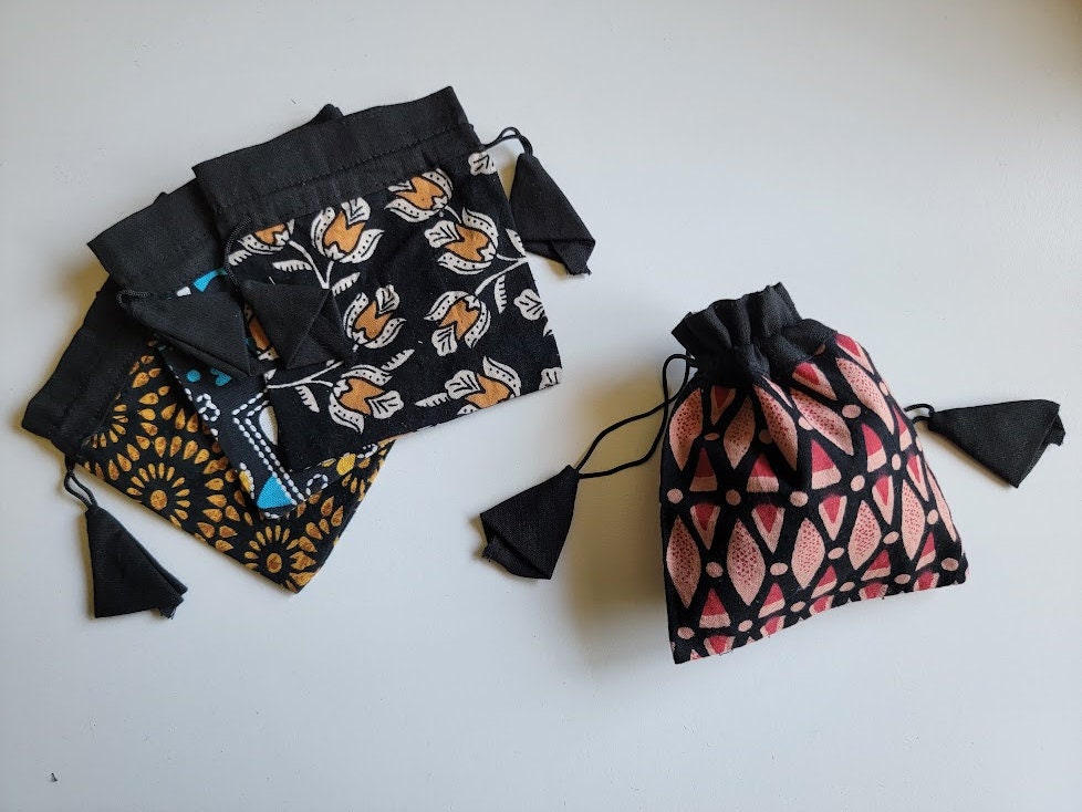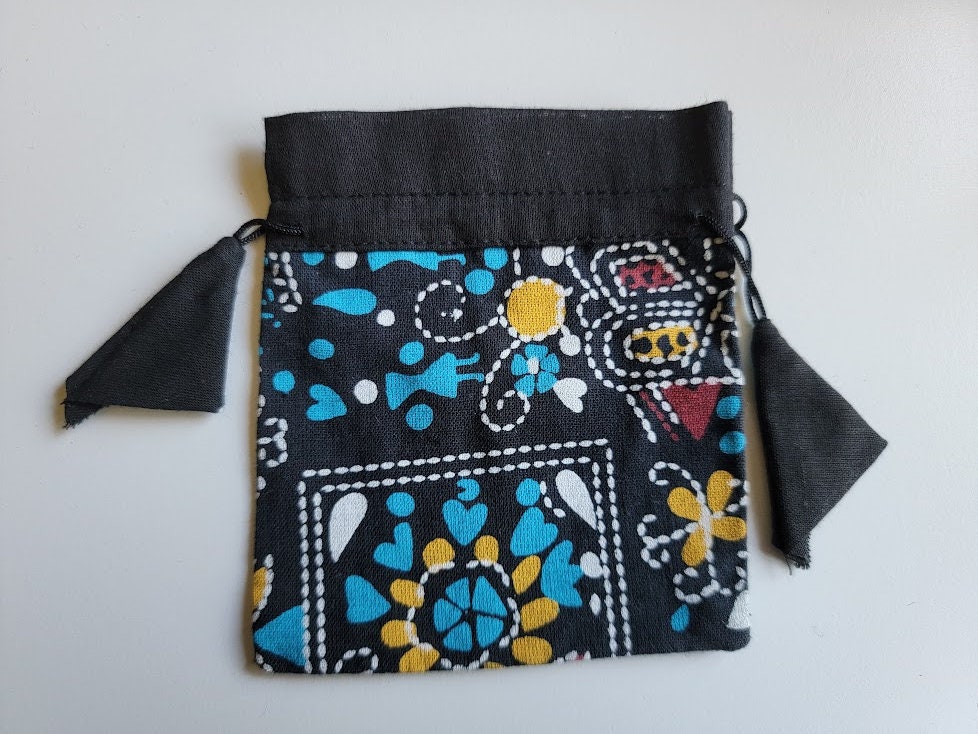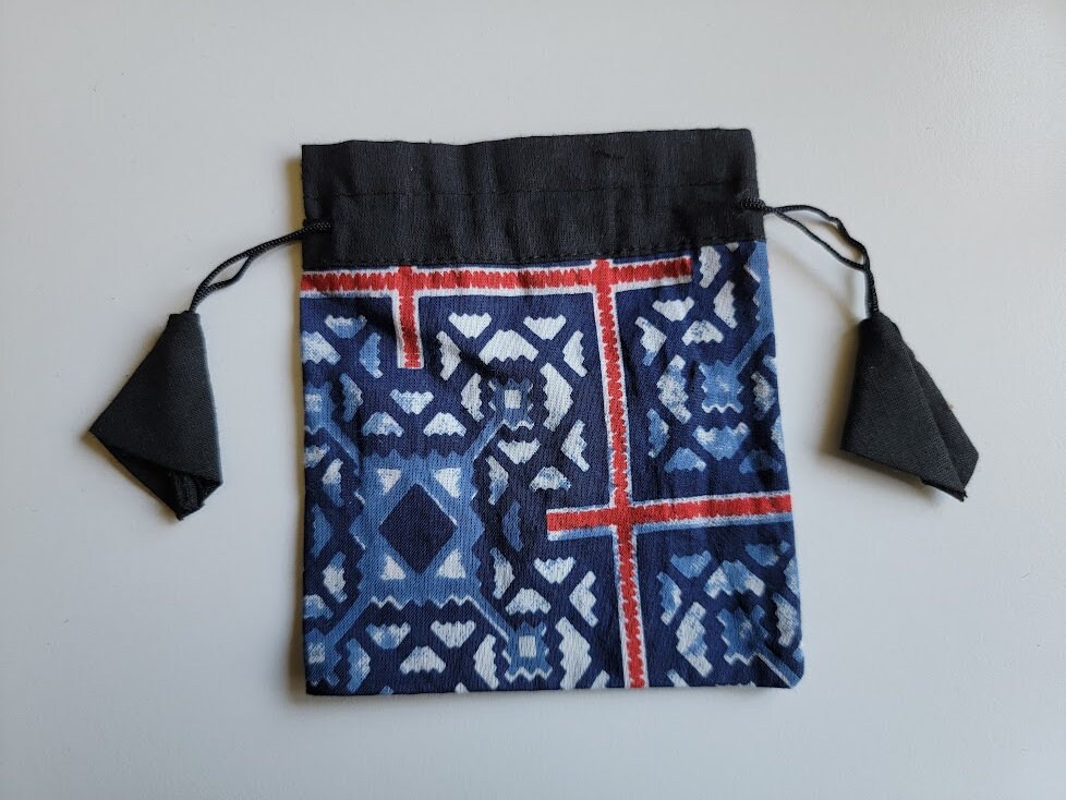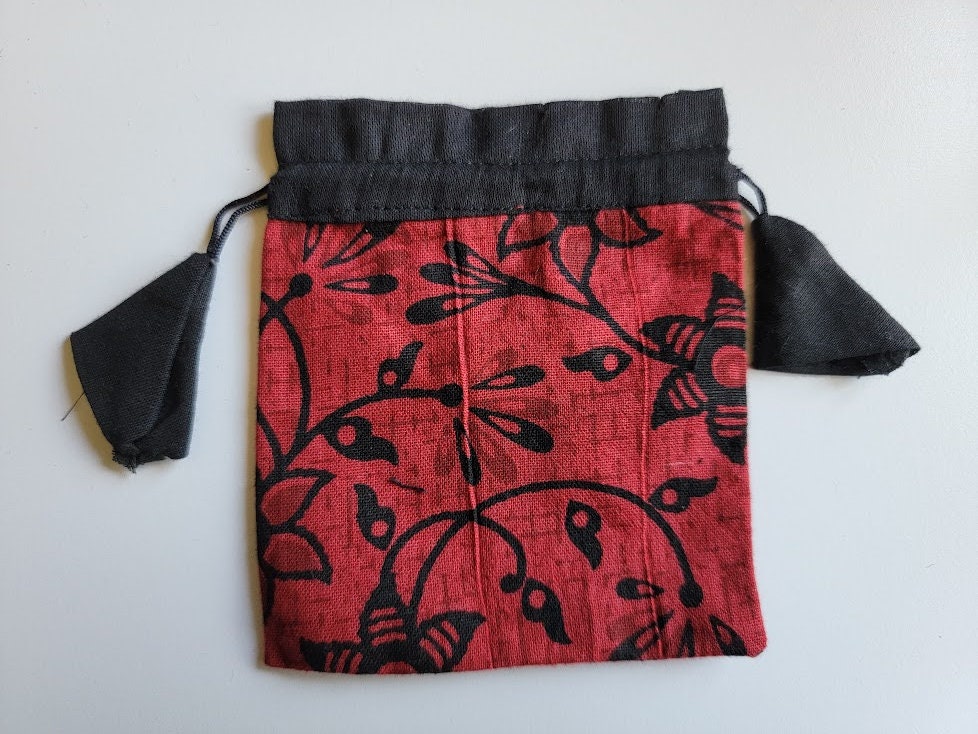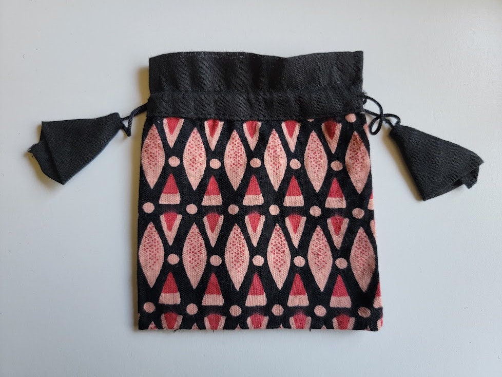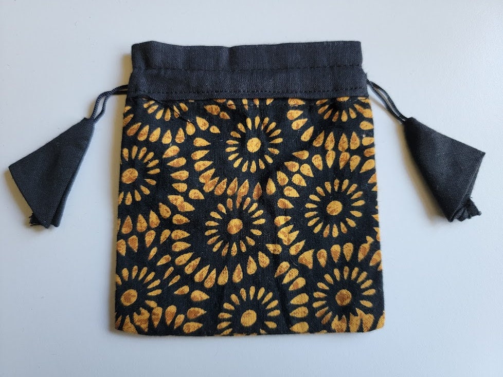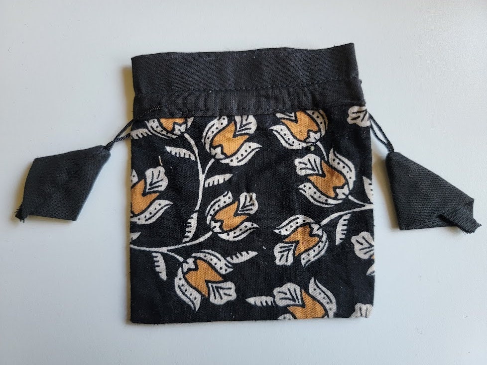 Beautifully hand stamped jewelry/coin purse. Black interior with no padding inside. Nice draw string to pull the bag closed.
