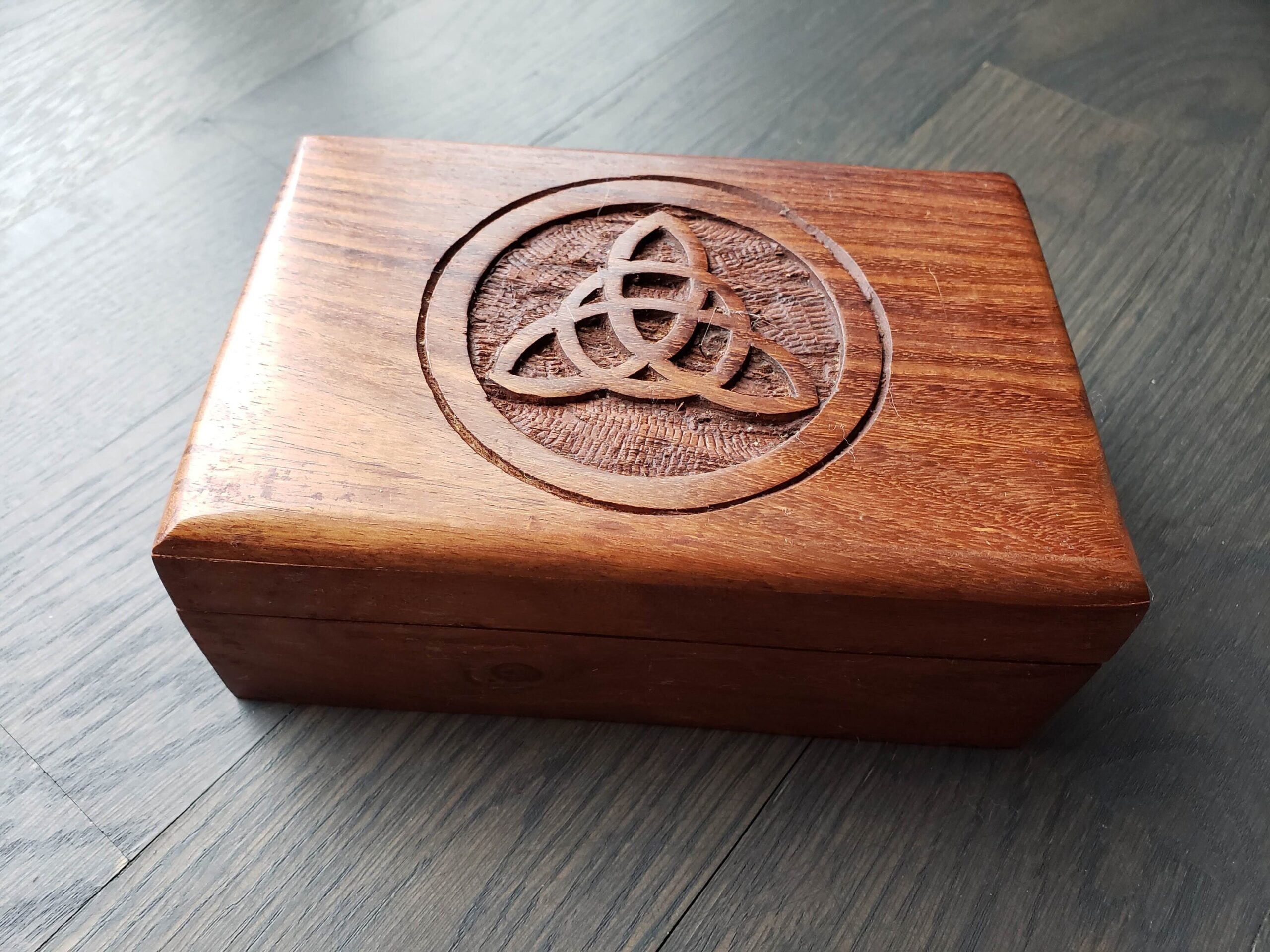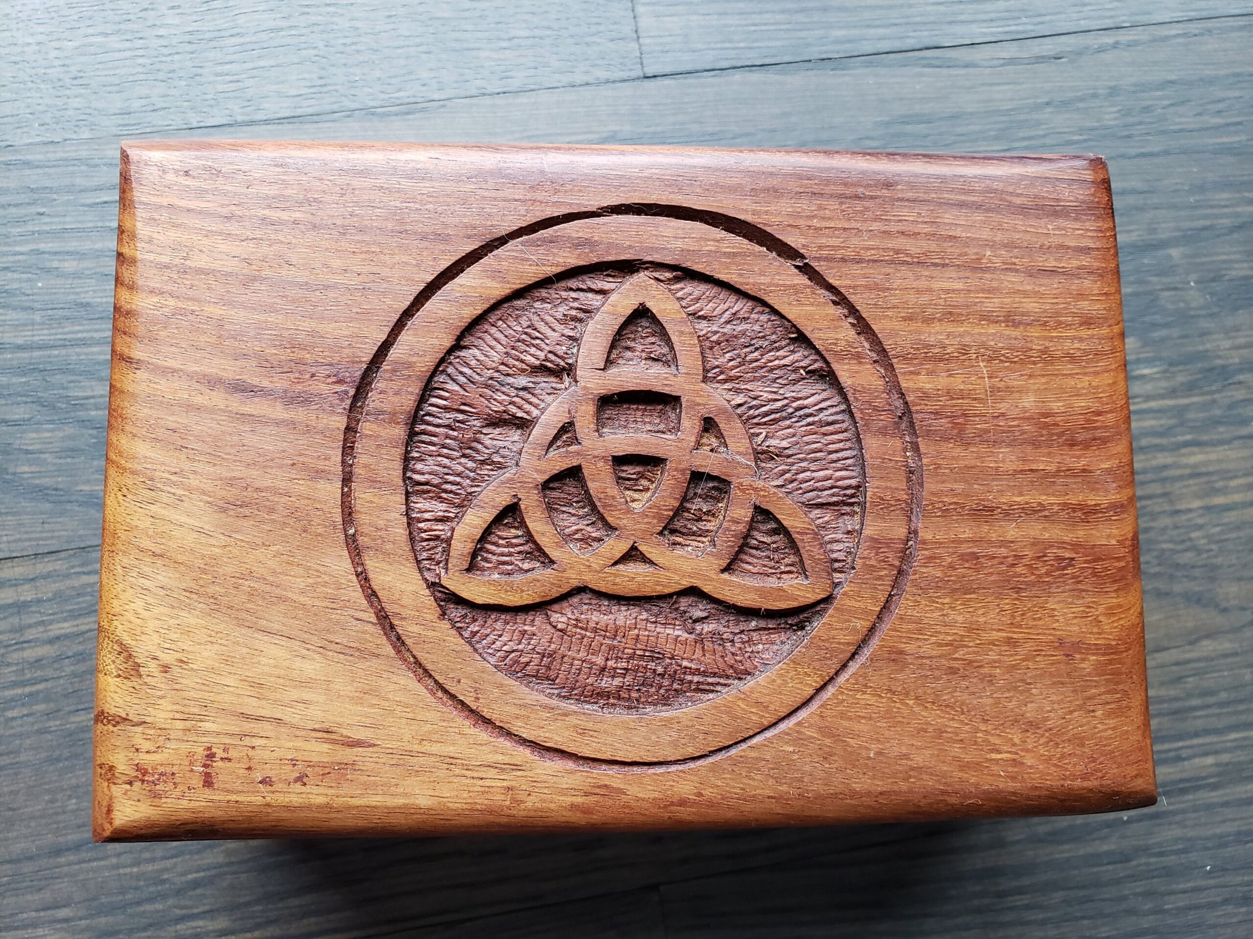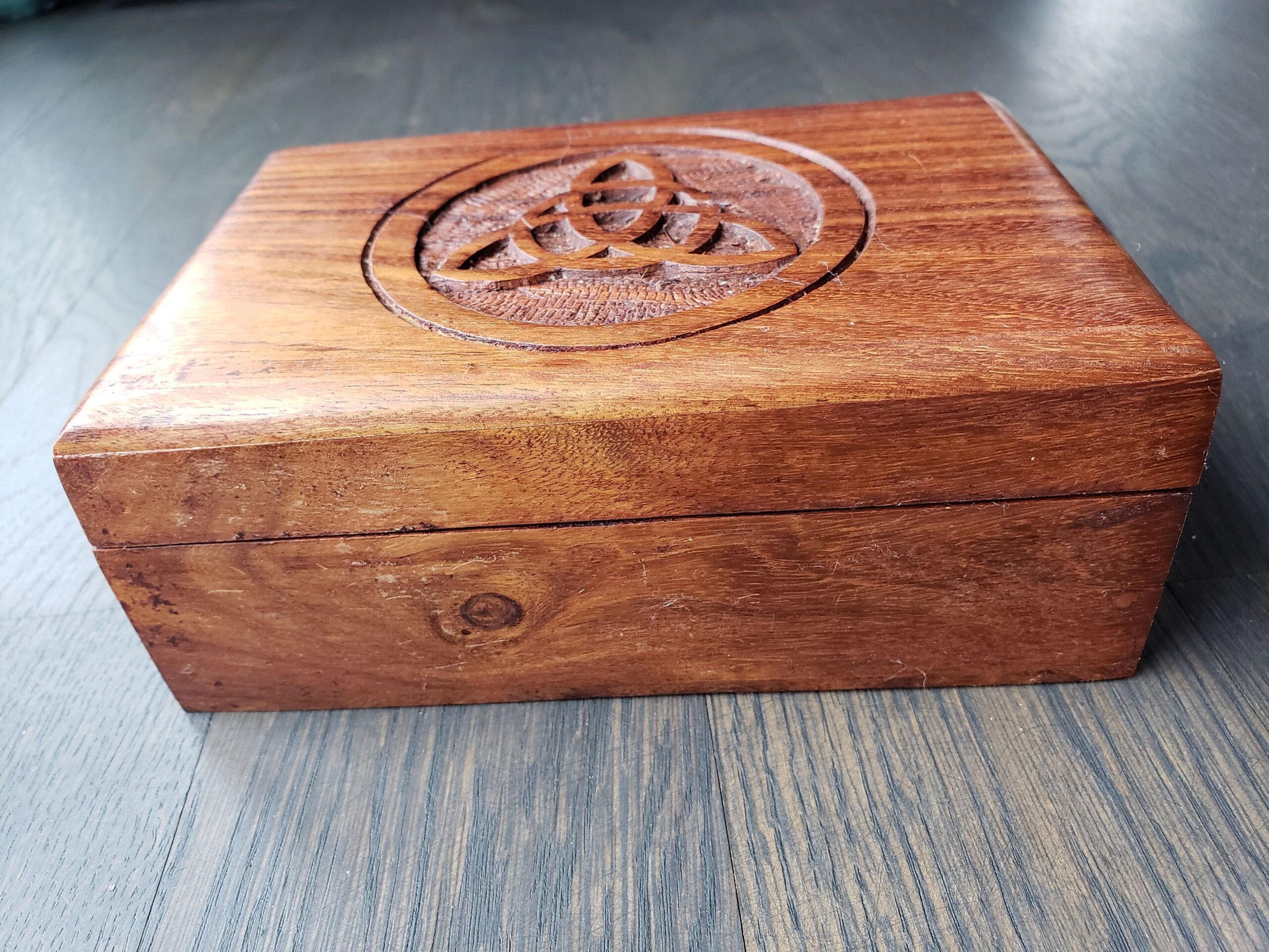 Beautifully hand carved wooden keepsake box that features an engraved Triquetra Celtic Knot.