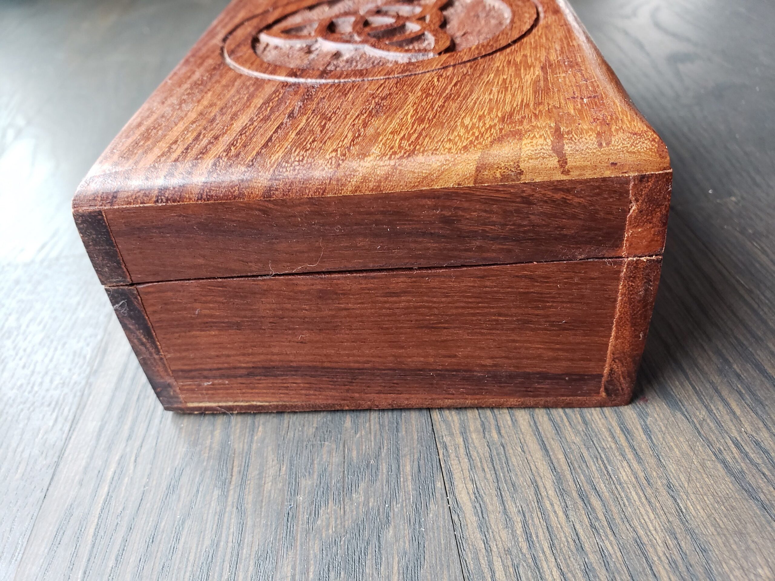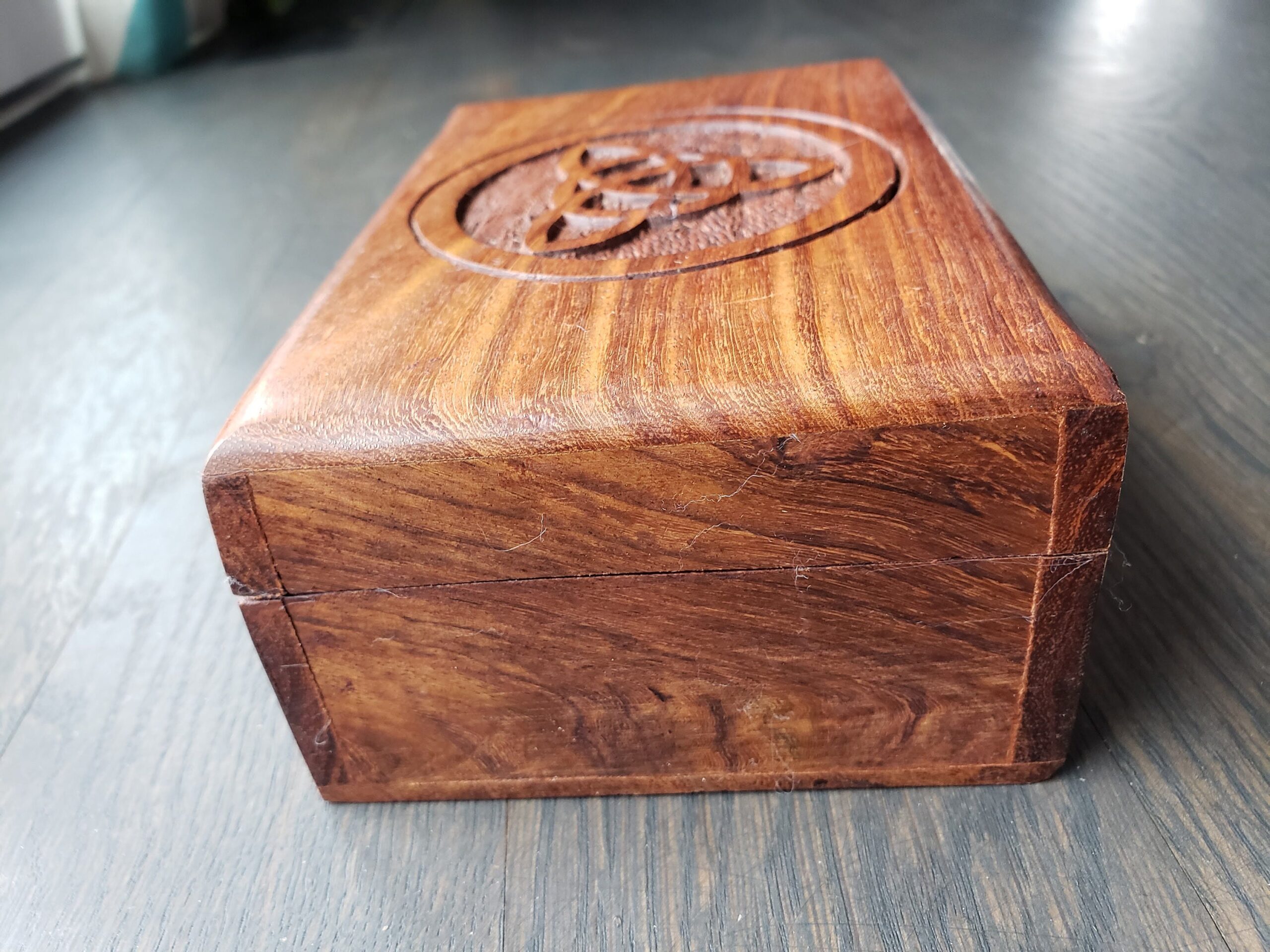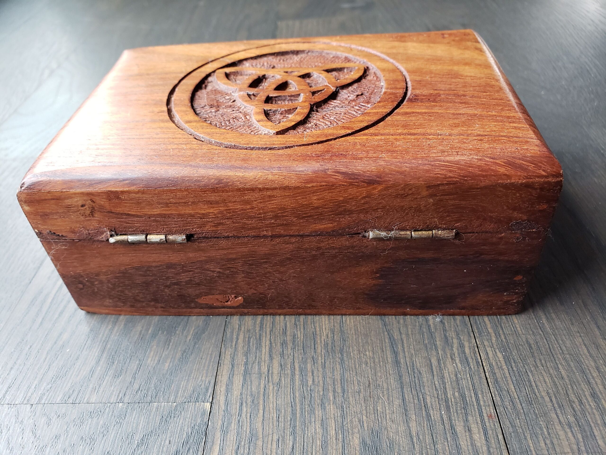 Beautifully hand carved wooden keepsake box that features an engraved Triquetra Celtic Knot.