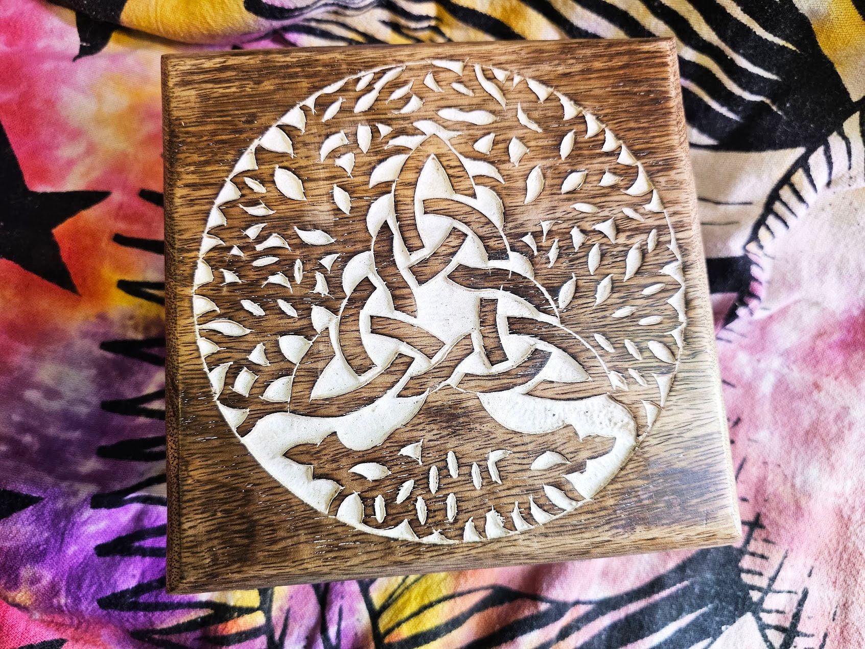 Beautifully hand carved wooden keepsake box that features an engraved Tree of Life Celtic Symbol painted with white.