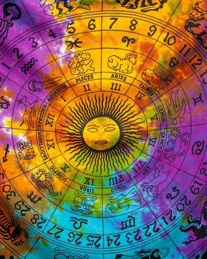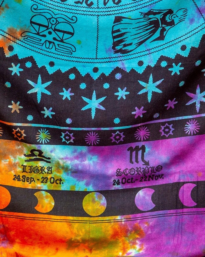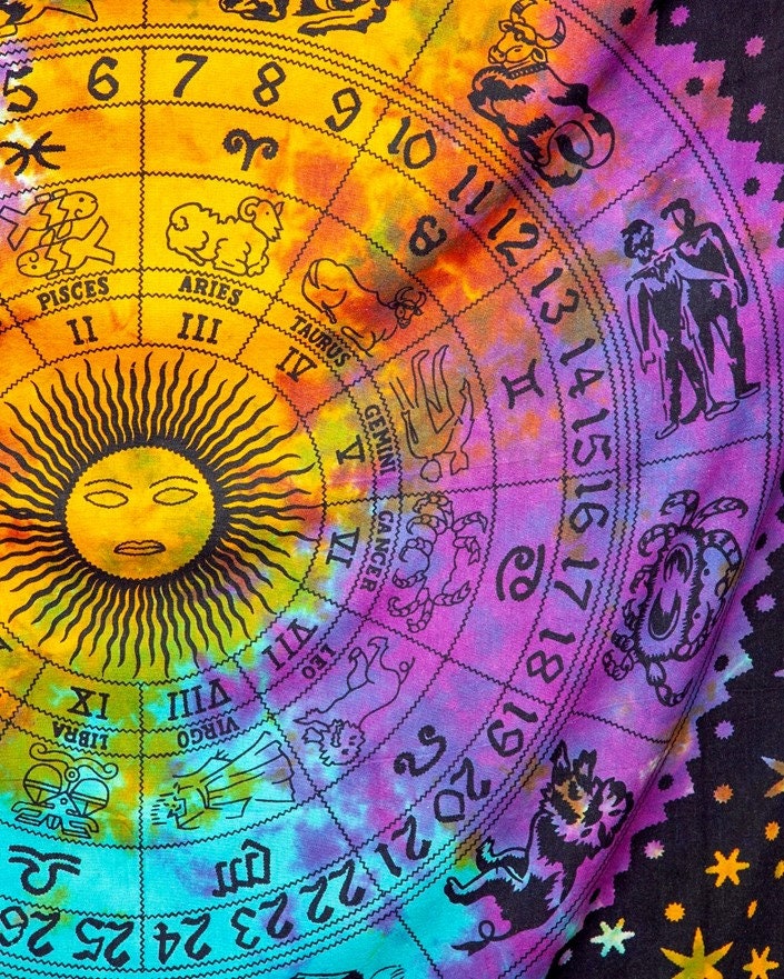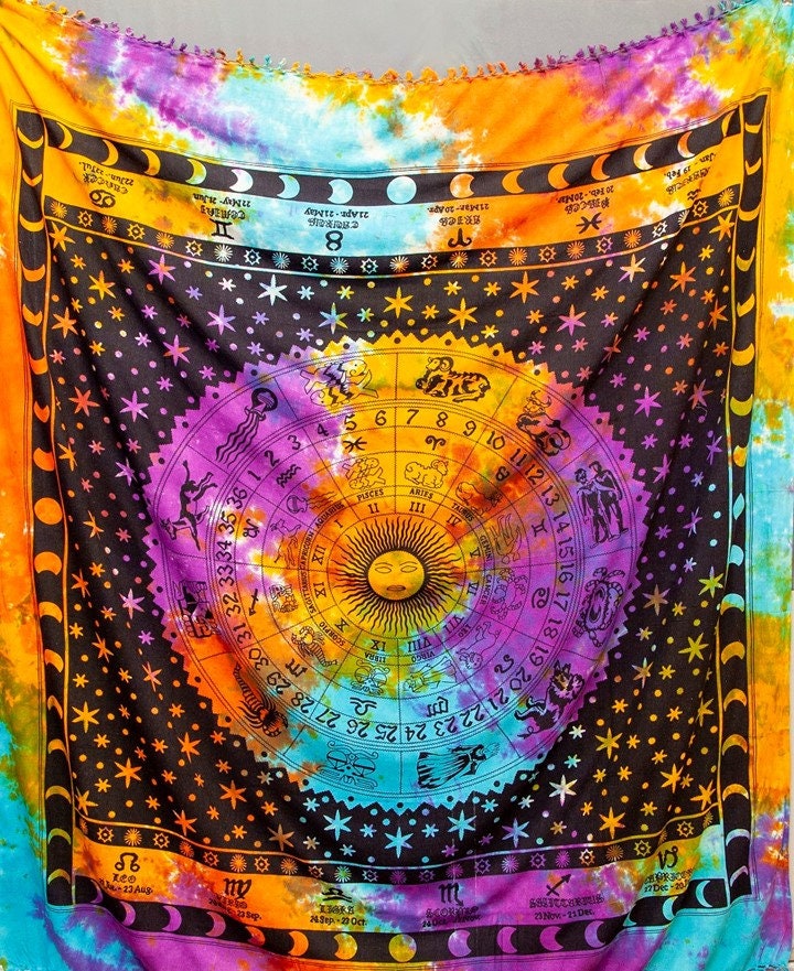 Information: Zodiac Fringe Tapestry, Celestial Heavy Weight tapestry with Fringe on 2 ends. Tie Dye Astrological Wall Hanging.