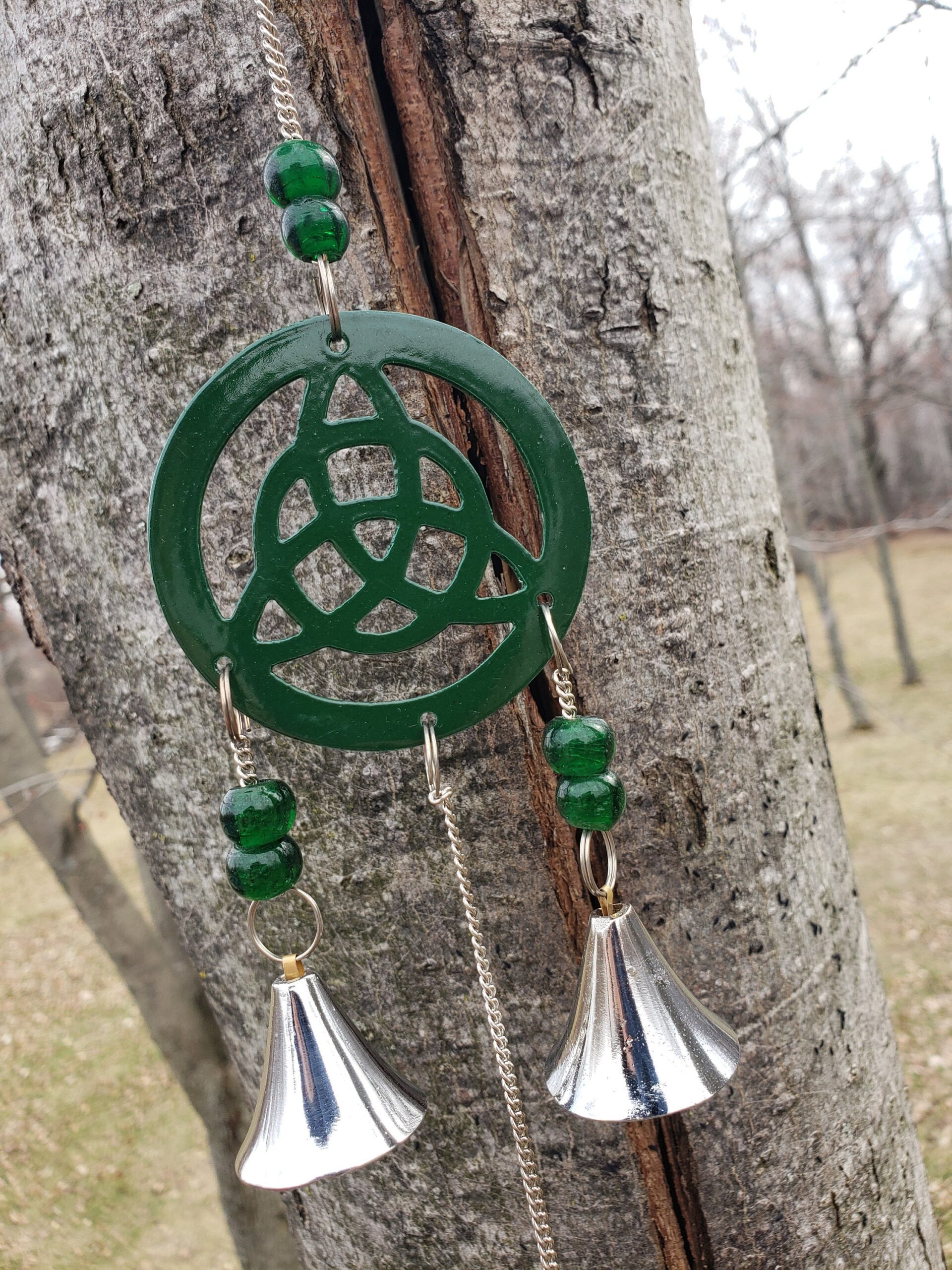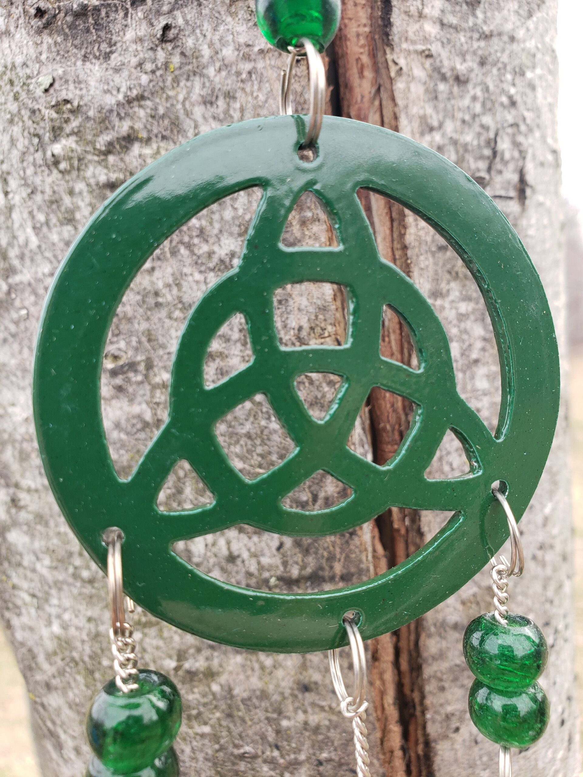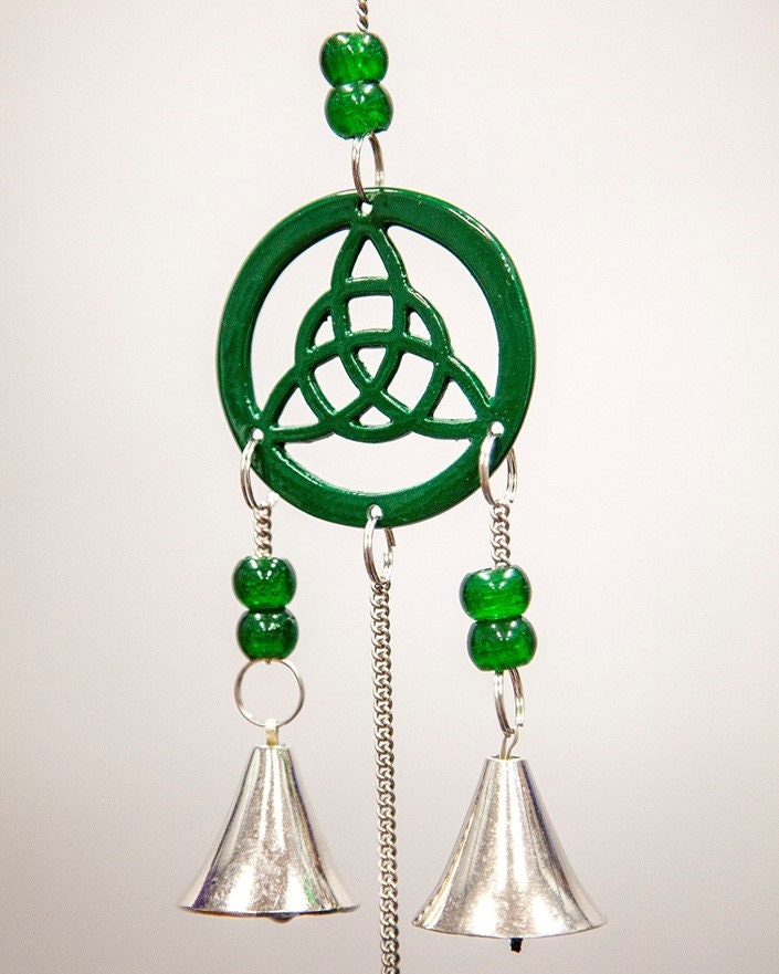 This long elegant dreamcatcher – inspired Celtic wind chime is perfect for hanging by windows, doorways, and sacred spaces. Features a three Celtic Triquetra Trinity Knots on a vertical chain, accented by hanging beads and bells.