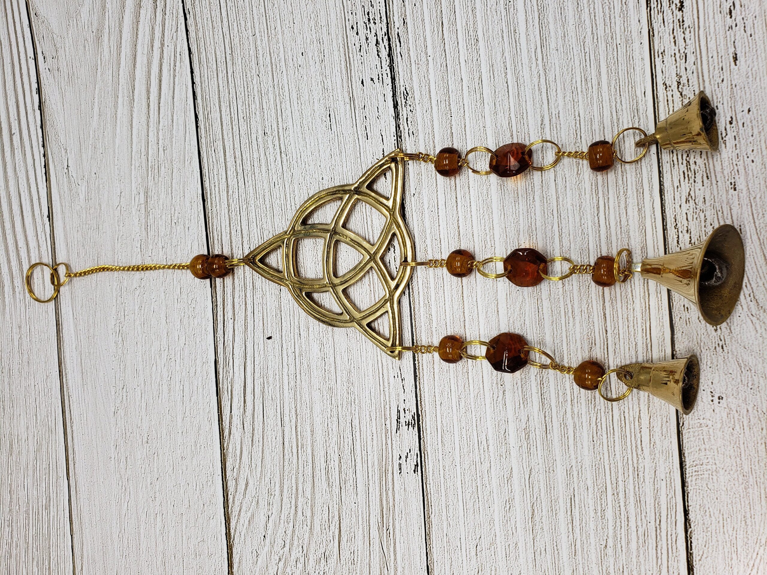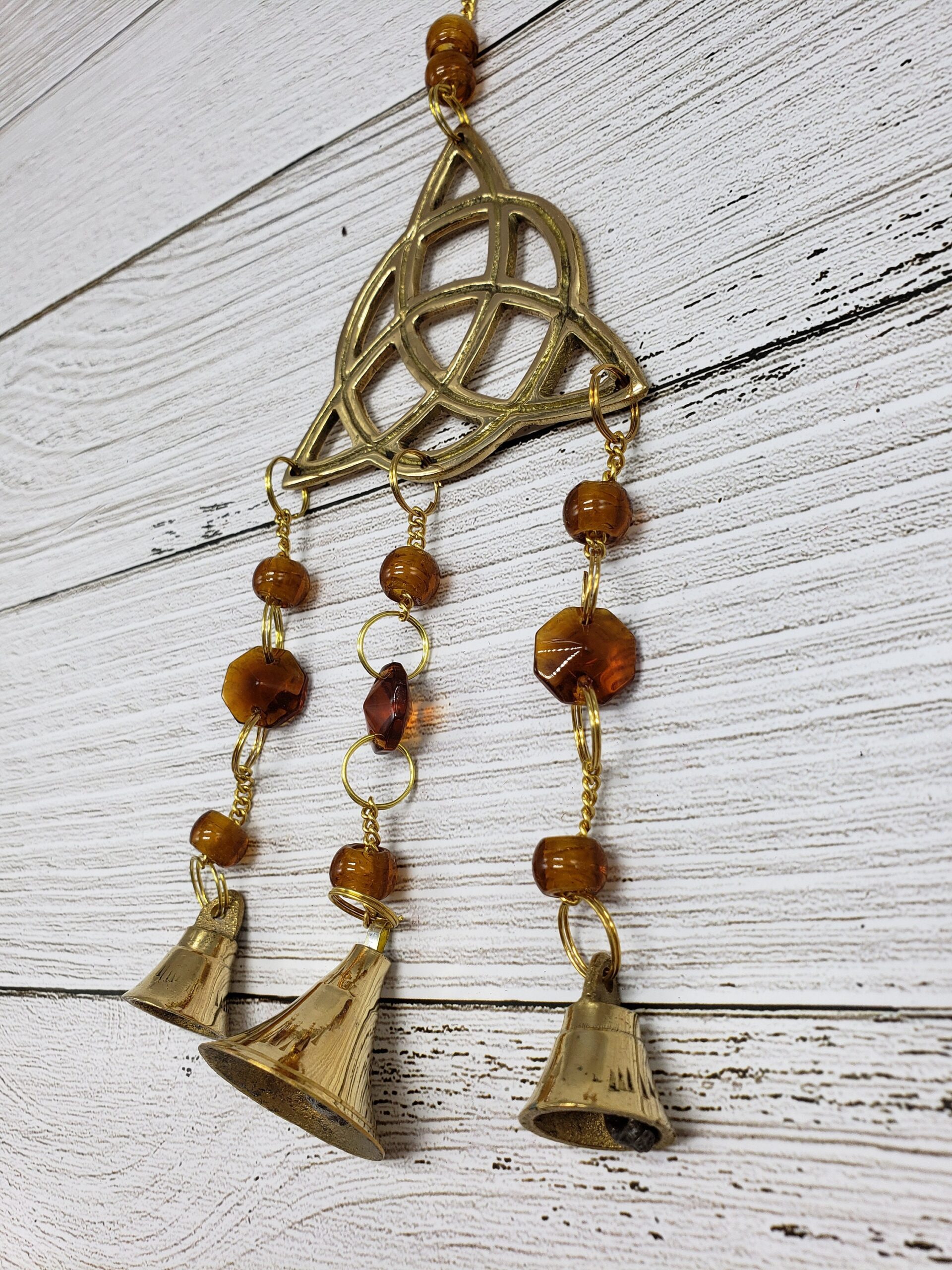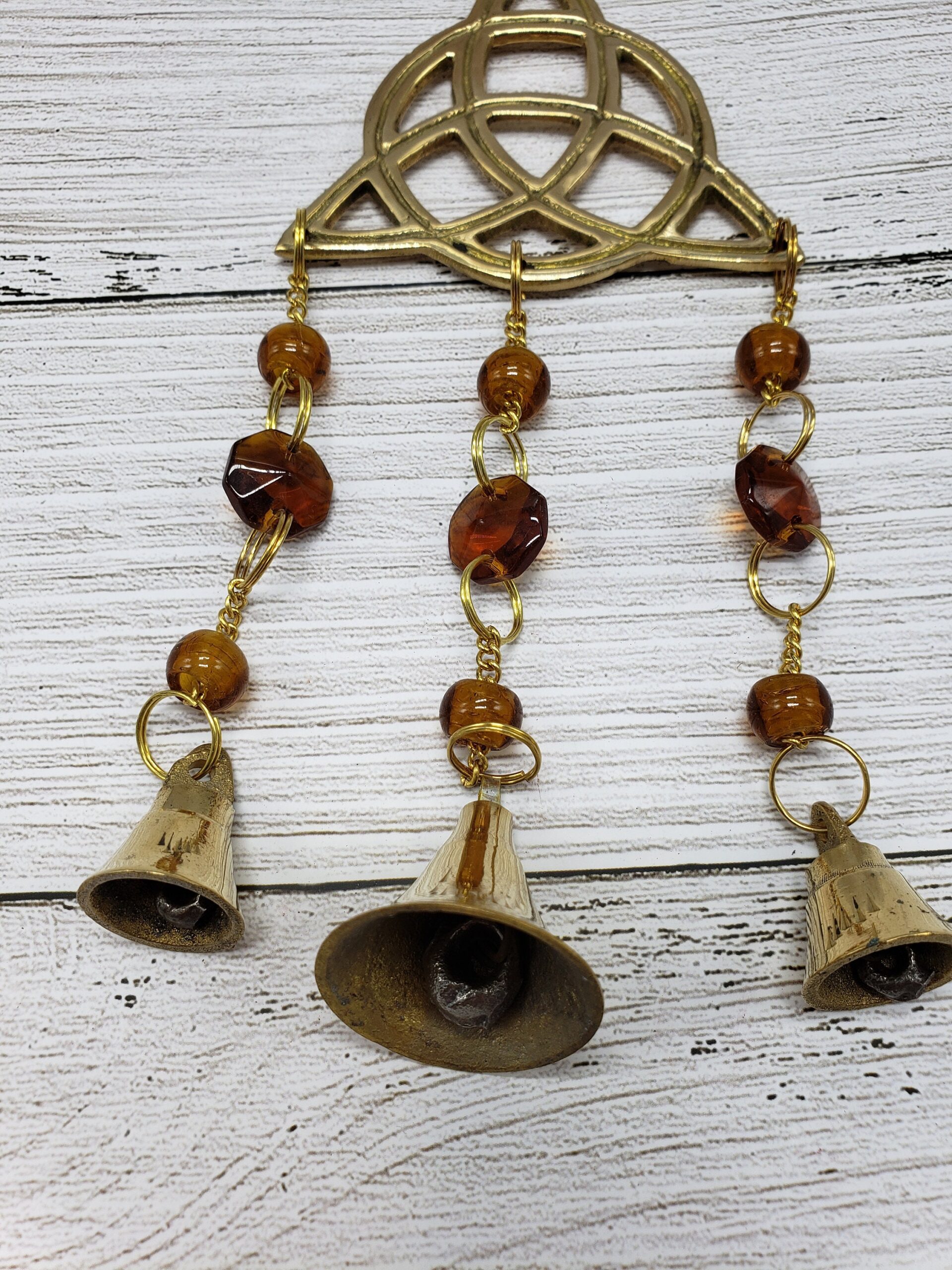 This small but elegant brass sun catcher – inspired Celtic wind chime is perfect for hanging by windows, doorways, and sacred spaces. Features a central Celtic Triquetra Trinity Knot accented by beads and bells hanging below.
