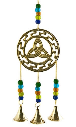 This small but elegant Brass sun catcher – inspired Celtic wind chime is perfect for hanging by windows, doorways, and sacred spaces. Features a central Celtic Triquetra Trinity Knot accented by beads and bells hanging below.